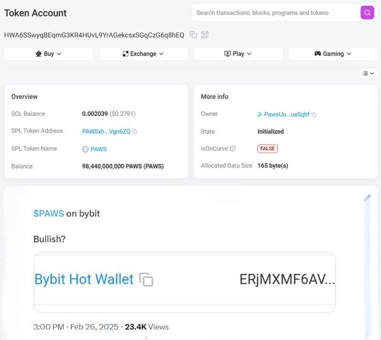 🐾 Листинг PAWS? Сегодня по сети гуляет информация о том, что недавно была создана монета paws на сети sol и отправлена на один из горячих Кошельков Bybit (похоже топ биржи не избежны). Конечно, эта информация ещё не подтверждена официальной командой, но имеет место быть. А также, листинг планируется на 31ое февраля. Ну и не забываем, что уже послезавтра листинг memhash и в этот раз будут фьючерсы на mexc, поэтому можно будет наконец-то встать в шорт.