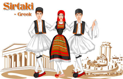- Греческие танцевальные ансамбли исполняют сиртаки в национальных костюмах — хитонах.