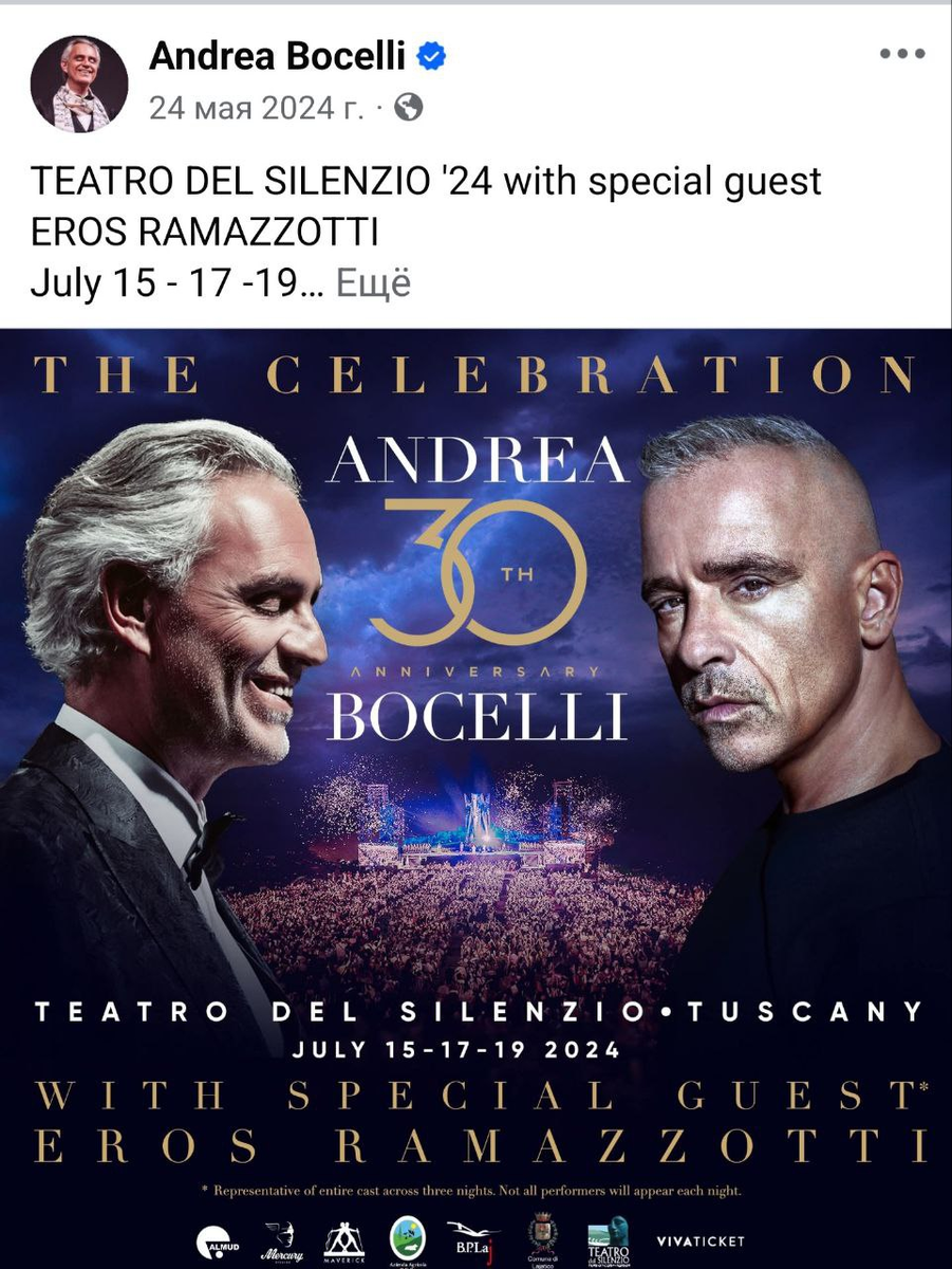 Тут важно пояснить, что первая песня Андрея Бочелли, с которой началась наша любовь, была дуэтом с Эросом Рамазотти и это одно из приятных школьных воспоминаний (аж от 1997 года). И я ярко представила, как было бы здорово услышать "Muzica e" живьём (вдруг не знаете, вот тут послушать можно) oh9bca7zzjta1g65.