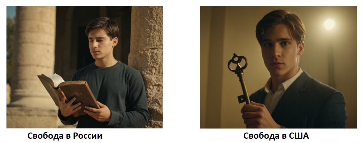 В России свобода — это ответственность перед обществом, тогда как в США — это защита прав личности. <<Что тебе ближе?>>