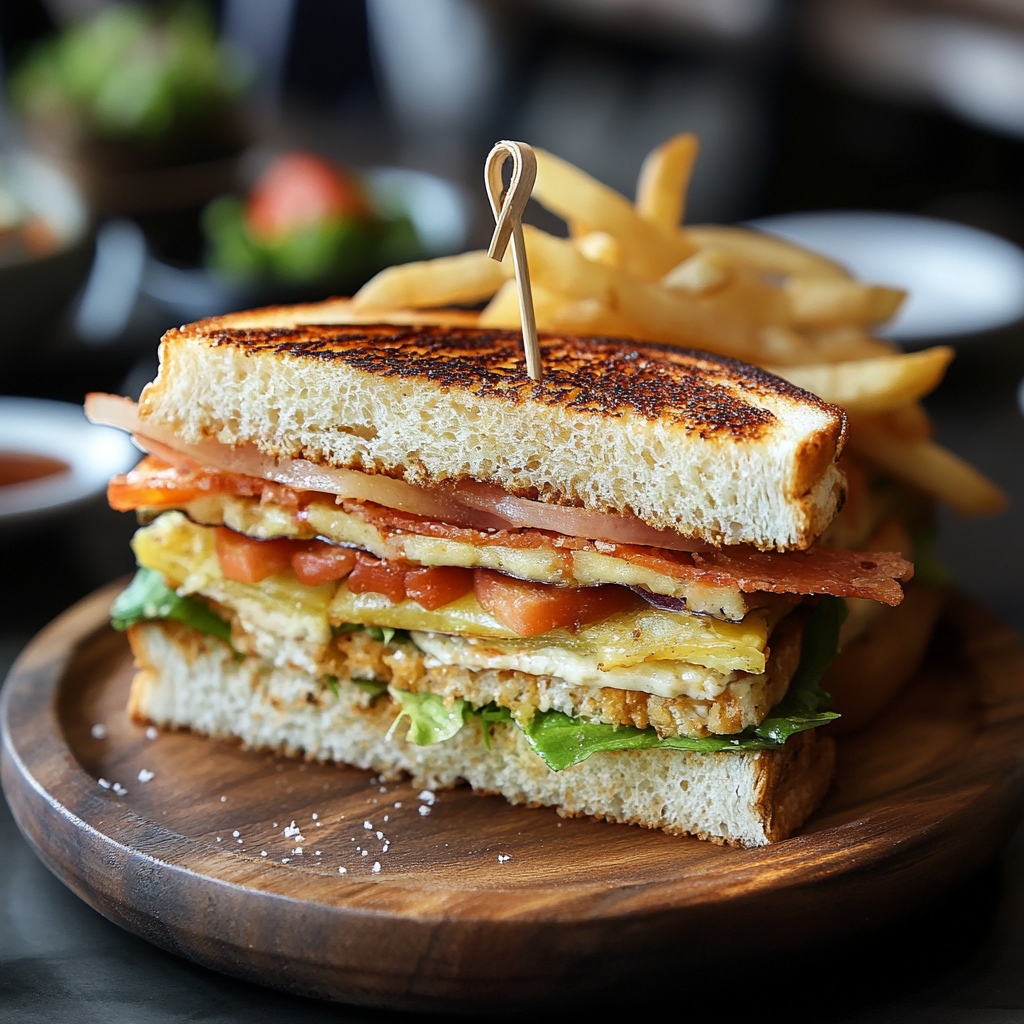 Клаб-сэндвич - это классический представитель американской кухни, который на протяжении более столетия остается символом простого и сытного обеда. Его точное происхождение неизвестно, но общепринято считать, что он появился в конце XIX века. Самая популярная версия гласит, что клаб-сэндвич был впервые подан в клубе «Саратога Спрингс» в Нью-Йорке. По второй по популярности версии он появился «Юнион Улаб» в Нью-Йорке, что подтверждается упоминанием о нём в журнале «The Evening World» в ноябре 1889 года, где приводился рецепт сэндвича. Но очевидно, что родиной этого сэндвича является Нью-Йорк. Классический клаб-сэндвич - это трехслойный сэндвич, традиционно наполненный индейкой или курицей, беконом, помидорами, салатом и майонезом. Все это удовольствие подается между тремя кусками тостового хлеба, нарезанными на четвертинки и скрепленными шпажками. Это не только вкусно, но и невероятно удобно. Классический клаб-сэндвич Попробуем приготовить знаменитый сэндвич в его классическом исполнении