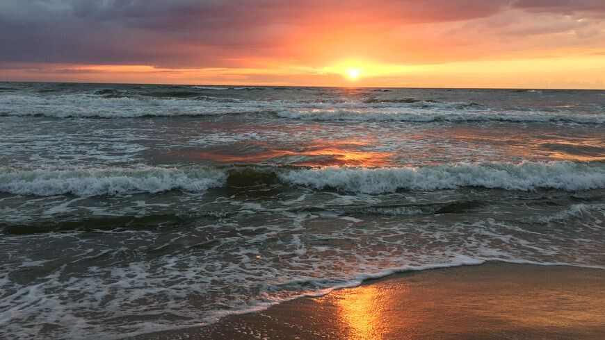 Гулять по пляжу приятно как день, так и вечером, ведь закаты здесь невероятны, наполняя море оранжевыми и розовыми оттенками.