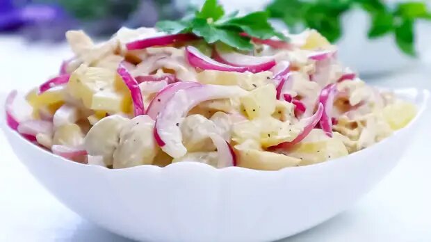 Этот рецепт салата достался мне случайно. Он буквально выпал мне в почту. Сначала я хотела рецепт выбросить. А потом приготовила в прошлом году летом на даче. В нём всего четыре ингредиента. А вот сочетание их удивительно. В нём сочетаются курица, маринованный лук и консервированные ананасы. Нам понадобятся следующие продукты: - Красный салатный лук - 2 шт - Отварное куриное филе - 1 шт - Маринованные шампиньоны - 1 банка. - Консервированные ананасы - 200 гр. - Сахар - 2 чайных ложки - Соль - 1 чайная ложка -Уксус яблочный - 4-5 столовых ложки - Вода - 1 стакан - Майонез - по мере надобности Приготовление: 1. 2 красных лука нарезаем тонкими перьями, добавляем сахар, соль, яблочный уксус, стакан воды и оставляем мариноваться на 25-30 минут. 2. Отварное охлаждённое куриное филе разделяем на волокна и выкладываем в тарелку. Отжимаем лук от жидкости и добавляем к курице. 3. Дальше добавляем маринованные шампиньоны, которые можно порезать. 4. Затем добавляем консервированные ананасы тоже по