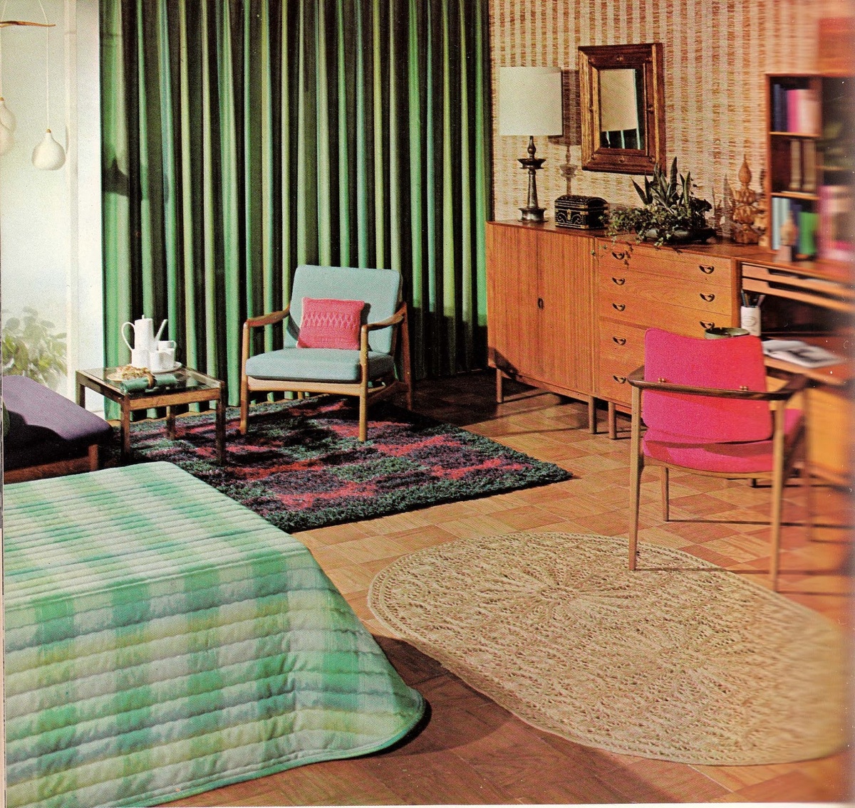 Большинство домов в 1960-х годах были обставлены эклектичной смесью мебели разных эпох, с крупными, смелыми изображениями, такими как постеры, ярко декорированные покрывала и жалюзи на фоне ярких стен. Зеленый (например, гороховый и тусклый), желтый, розовый и оранжевый (например, персиковый и шафрановый) оттенки были популярны для обоев, ковров, штор, диванов, сидений стульев и подушек, часто с узорами или яркими цветами. Английский декоратор Дэвид Хикс оказал большое влияние на интерьеры 1960-х годов, вдохновляясь яркими цветами, ассоциирующимися с Индией. Хикс популяризировал использование «психоделических узоров и кислотных цветов», достигнув пика в период 1967–1973 годов, когда возник интерес к движению хиппи и «власти цветов». В ту же эпоху Дороти Дрейпер, один из ведущих дизайнеров интерьеров Манхэттена 1960-х годов, использовала «скучный» белый и «блестящий» черный как одно из своих любимых сочетаний. В качестве материала для мебели полипропилен, который производился в цветах,