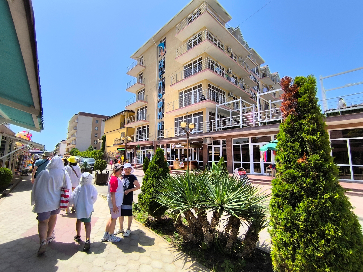 В моём отеле «Космос» было действительно космически: симпатичные номера, подогреваемый бассейн, столовая, бар, где подают отличный шашлык (пиво тоже вкусное), детская игровая площадка. Не самый бюджетный вариант, потому что в 7 минутах от моря и 38 секундах от входа в аквапарк «Олимпия».