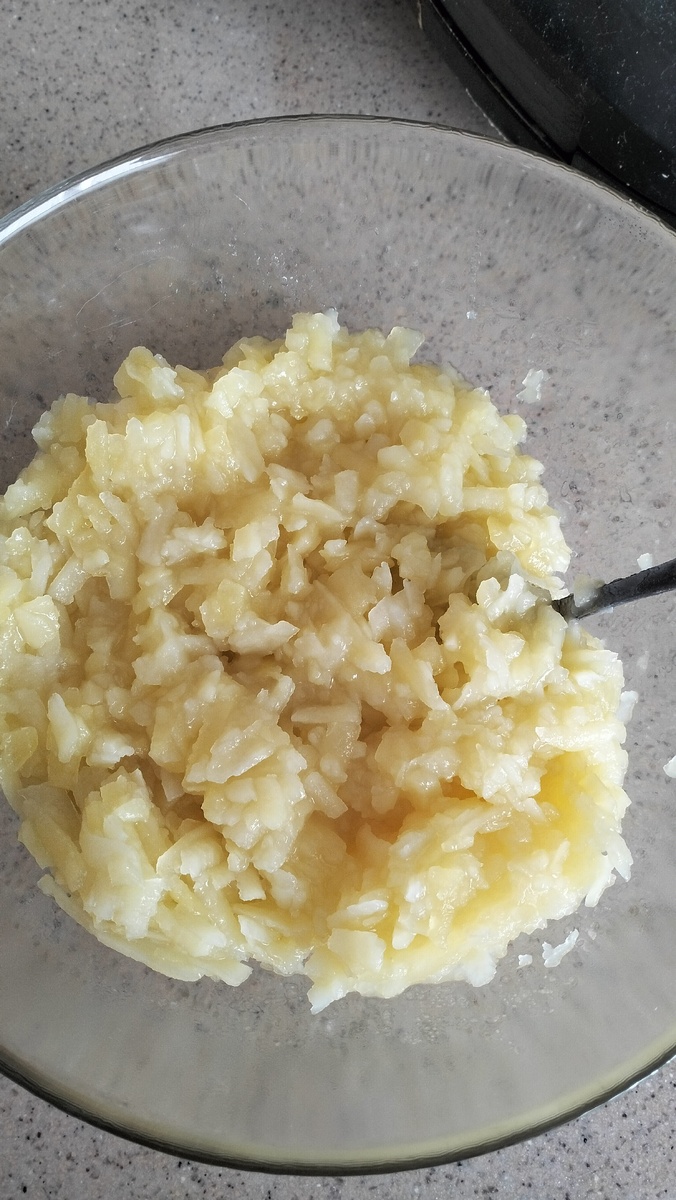 В предыдущей статье писала, что у меня начала прорастать картошка и её нужно срочно тратить. Благо, что её немного, штук 12-15 (есть ещё в холодильнике, она нормальная ещё, не растёт, на недельку-другую хватит). Долго думала, что бы сделать. Жареную не хочу, пюрешку - очень много получится. С пирожками или варениками лень возиться. Драники недавно делала. Зразы?! Нууу... Можно... И тут вспомнила про такие заморские картофельные котлетки, под странным названием "хашбраун". Готовила только разочек, несколько лет назад, понравилось. Но почему-то больше не делала. Это не классические картофельные котлеты, потому что делаются не из пюре, а из тертой картошки. Но и не драники, потому что картофель с предварительной термической обработкой. Но по порядку! Берём сырой картофель, чистим, трём на крупной терке. Промываем. И опускаем в кипящую солёную воду! Да, варим, но сразу натертую. После закипания варим 3-5 минут. Откидывает на сито, можно промыть холодной водой (но я так не делаю) Вот т