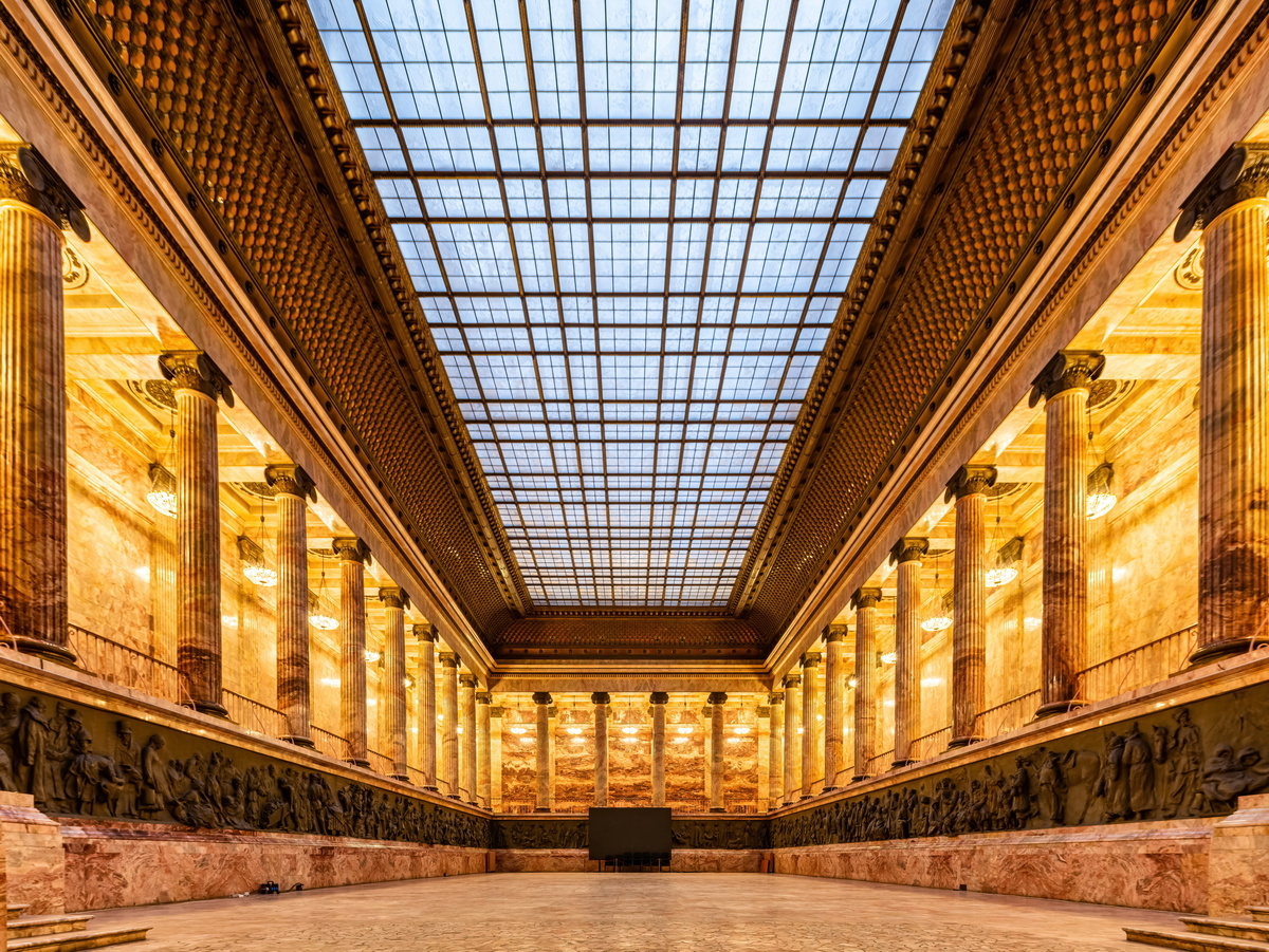 Архитектор: В.Ф, Свиньин Скульпторы: М.Я. Харламов, В.С. Богатырев Годы строительства: 1903-1916 Площадь вместе галереями: 935 кв. M. Высота зала: 15,7 м Размеры горельефа: длина 96 м, высота 1,87m