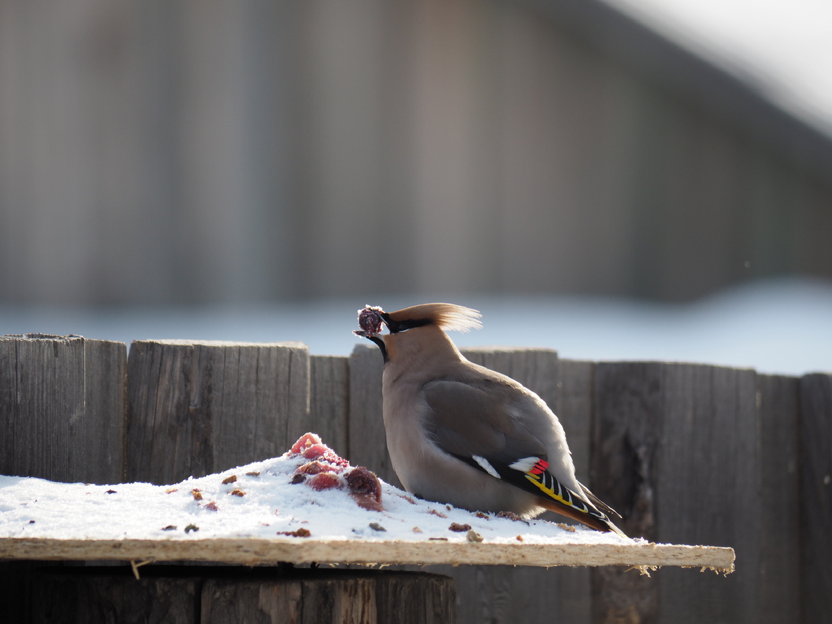 Своим присутствием порадовала свиристель. Удивило, что прилетела одиночка: яркие птицы с хохолками обычно дружны и летают большими стаями. Облюбовав дерево или кустарник с ягодами, они устраивают шумный прием пищи, сопровождаемый приятной трелью. Вид часто встречаемый в Усть-Баргузине, но к нам так близко не подлетал - ягодных деревьев поблизости практически нет. А теперь вот надеемся, прознали они про нашу кормушку и будут навещать 😊