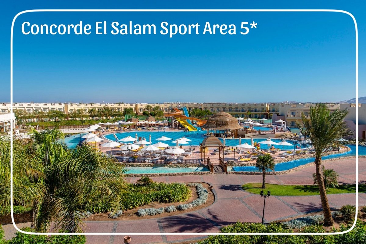 Отель находится на второй береговой линии. Выход к пляжу — через соседний отель Concorde El Salam Front Area 5*, территорией которого можно свободно пользоваться. Между Concorde Sport и Concorde Front каждые 15 минут курсирует автобус. В совокупности территория двух отелей — огромная.