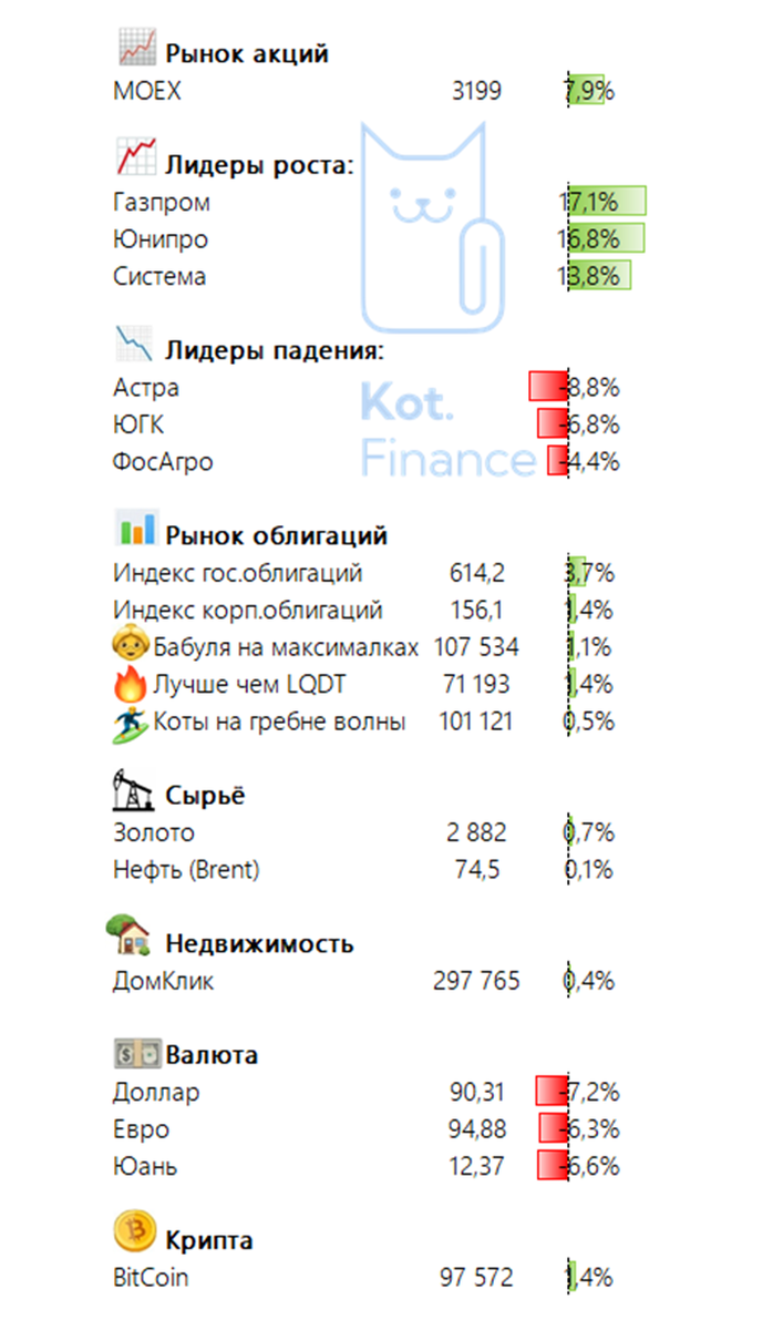 Звезды сошлись и были благосклонны к российскому фондовому рынку. Праздник и у акционеров, и у бонд-холдеров. Газпром, Юнипро, Система в лидерах 🤝Присоединяйся к сообществу Кот.Финанс -- Новые размещения •КЛВЗ Кристалл (без рейтинга) флоатер КС+7% на 3 года. Интерес: ★★☆☆☆ •КЛВЗ Кристалл (без рейтинга) фикс на 3 года 28%. Интерес: ★★☆☆☆ •Новые технологии (А-) флоатер КС+6% на 2 года. Интерес: ★★★★☆ •Новые технологии (А-) фикс на 2 года 26%. Интерес: ★★★☆☆ •Металлоинвест (ААА) фикс на 1 год 10,5% в ¥. Интерес: ★★☆☆☆ •Манимен (ВВВ-) фикс на 3 года 27,5%. Интерес: ★★★☆☆ Интересные события • Трамп наш? Выросли и акции, и ОФЗ, и облигации, и рубль. Постновогоднее ралли? • Ключевая ставка 21%. ЦБ ужесточил прогноз средней КС на 2025 год. Похоже, фиксами закупаться рано • "Домодедово" выплатило купон по "замещающим" облигациям. Но градус напряжения вокруг него, и ГК Борец не снизило • Суд наложил обеспечительные меры на предприятия холдинга "Борец" • Владельцы облигаций "Совкомбанка" могут п