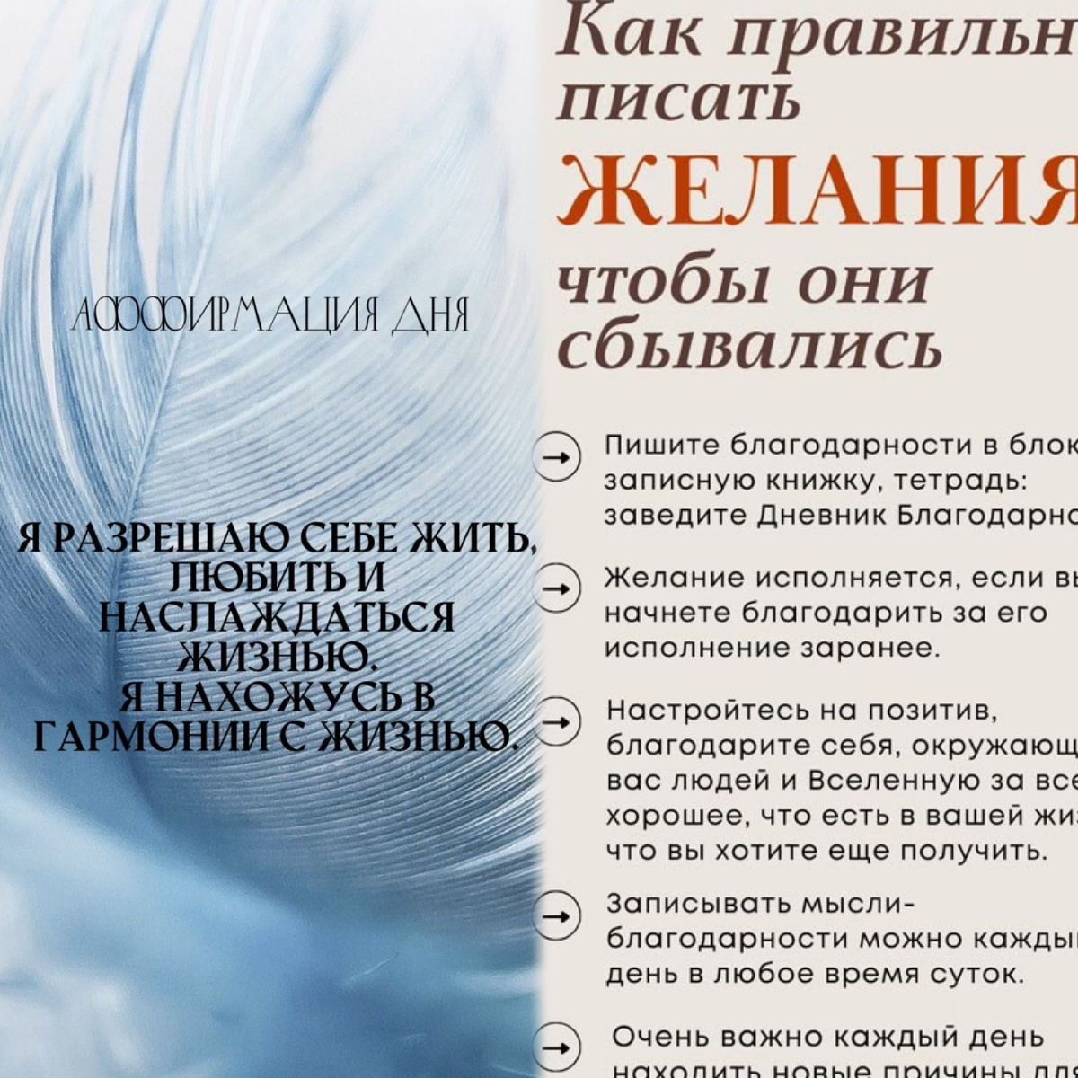 Добро пожаловать 🤗 Аффирмации — это короткие положительные утверждения, которые помогают изменить негативные установки и укрепить уверенность в себе. Они используются для улучшения настроения, повышения самооценки и достижения целей. Чтобы они были эффективными, важно соблюдать несколько правил при их выполнении. Как правильно выполнять аффирмации? #### 1. Формулировка утверждений - Позитивность: Аффирмация должна быть сформулирована в положительном ключе. Например, вместо «Я больше не буду нервничать» лучше сказать «Я спокоен и уверен в себе». - Настоящее время: Утверждение должно звучать так, будто оно уже произошло. Например, «У меня есть много денег», а не «Я хочу иметь много денег». - Конкретика: Чем конкретнее утверждение, тем легче будет поверить в него. Например, «Я зарабатываю 100 тысяч рублей в месяц», а не просто «Я богат». #### 2. Регулярность - Повторяйте аффирмации ежедневно. Лучше всего делать это утром после пробуждения и вечером перед сном. Регулярность по