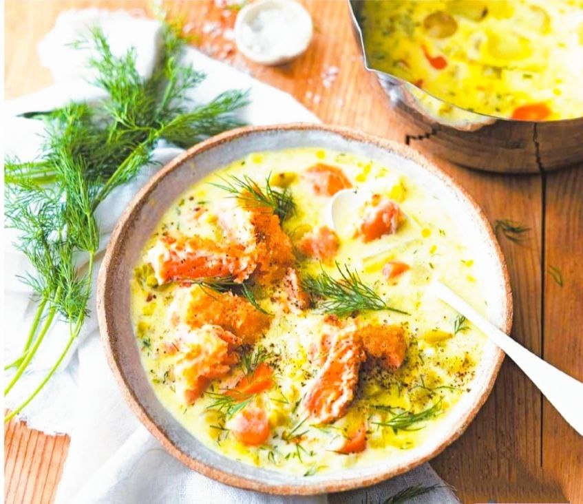 Крем-суп из лука-порея, моркови и форели