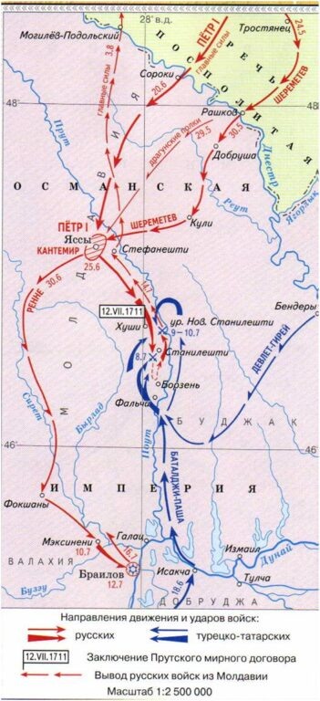 26 июня 1711 года, русская армия пересекла реку Днестр, и оказалась в Молдавии. Уже было решено, что русская армия 27-го числа выступит следующим образом 2 пехотные дивизии генералов Алларта и фон Энцберга с казаками, за ними следовал Пётр I с гвардейскими полками, 2 пехотными дивизиями князя А.И. Репнина и генерала А.А. Вейде, а также артиллерией под началом генерал-поручика Я.В. Брюса.