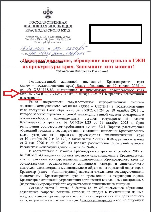 Далее, жалоба поступила в прокуратуру края. Прокуратура края зачем-то, в нарушении ФЗ №59 и приказа ГП РФ №45 перенаправила жалобу тем, на кого я ни раз жаловался, то есть, в ГЖИ.
