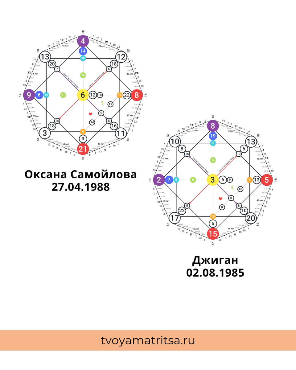 Сама комбинация 11-4-20, образует программу “Укрощение агрессии, дрессировщик”, непростая программа, создающая мощную энергию в паре, при которой возможна борьба за лидерство, стремление подавить своего партнера, управлять его жизнью, подчинить. Учитывая анализ личных матриц, Оксана и Денис (Джиган) могли меняться в этих ролях. И их задача научиться управлять этой силой внутри пары, направлять эту энергию в созидательное русло: бизнес, спорт, sекс.