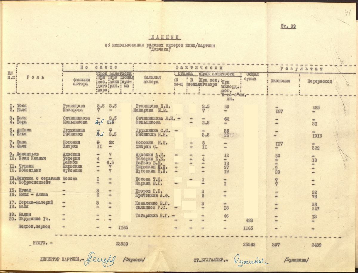 П.13 меня особенно порадовал. Я уже писал об участии Тамары Носовой в «Девчатах» в статье ««Девчата». Их было не 5, а 6…», но у читателей часто возникал вопрос – а кого она играла в фильме? Я был уверен, что, судя по сохранившимся фото с раннего этапа съёмок, Носова играла сборную роль «девицы с серьгами» и поварихи Гавриловны. Теперь вот этот бухгалтерский документ официально подтвердил по крайней мере половину моей версии. Тоже немаленькое открытие.