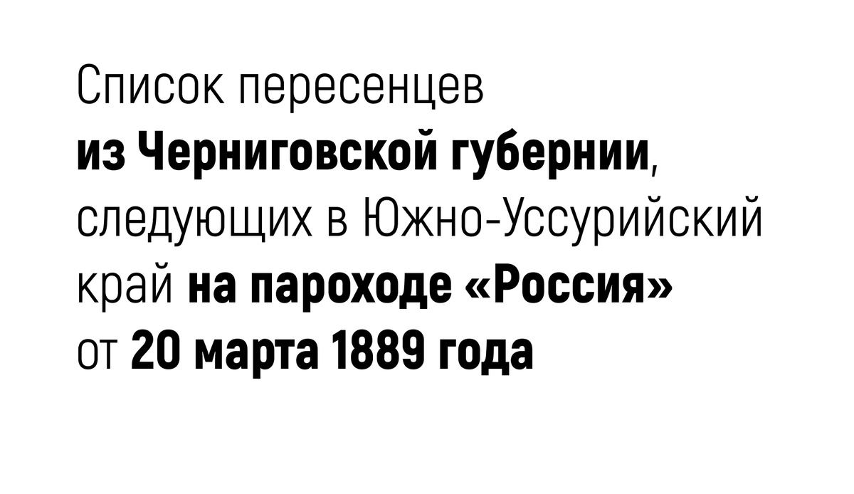 Ниже привожу список своекоштных (т.е. прибывших за свой счет) семей-переселенцев из Черниговской губернии, Борзнянского и Нежинского уездов, следующих в Южно-Уссурийский край на теплоходе «Россия» от 20 марта 1889 года с указанием ФИО и возраста главы семьи, сословия и количества человек в семье (количество человек указано вместе с главой семейства).