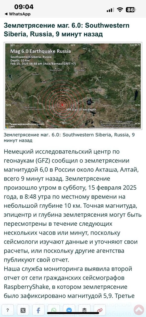 Доброго субботнего утречка всем! Наше сегодняшнее утро началось с подземных толчков, причём довольно ощутимых. Я сидела пила чай и вдруг почувствовала что меня качает, очень так хорошо качает. Сидящий на против меня муж удивленно посмотрел на меня и поинтересовался хорошо ли я себя чувствую, почему качаюсь? Говорю что все нормально, наверное землетрясение, на что он только посмеялся 🤭 Я сидела на табуретке и четко ощущала как меня раскачивает, а вот сидящий на диване муж, ничего не почувствовал. Живем мы в частном доме. Дети, живущие в панельных домах на 7 и 9 этажах в Барнауле, эти толчки ощутили сильней. Качались люстры, звенела посуда. Продолжалось все совсем недолго, наверно с минуту. Потом сын прислал это сообщение, оказывается действительно было землетрясение . Эпицентр находится от нас приблизительно на расстоянии 500-600км и мы это ощутили, а каково было жителям данного населенного пункта страшно подумать. Вот что-то природа на нас осерчала, то метели, то штормовые ветра,