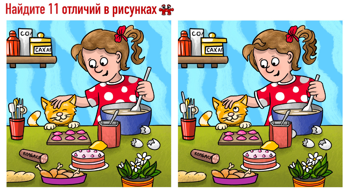 Сегодня у нас новый тест на тему кулинарии. Девочка с котиком учатся готовить. Наша задача отыскать 11 отличий между картинками. Кто найдет все - молодец!