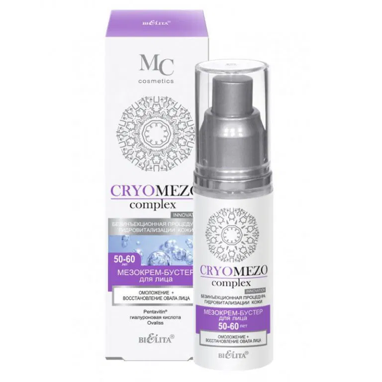 Мезокрем-бустер CRYOMEZO complex от «Белита» — это многокомпонентный продукт, содержащий как традиционные (растительные масла, витамины, гиалурон), так и более «современные» ингредиенты (пептиды, глауцин, полимерные загустители). Он ориентирован на следующие эффекты: