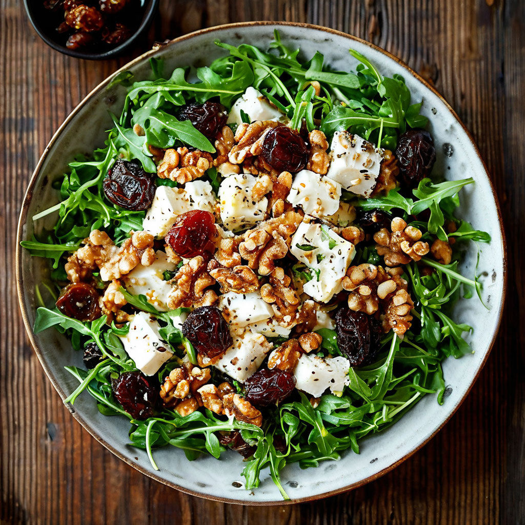 Салат из рукколы с грецкими орехами, сушеной вишней и фетой.