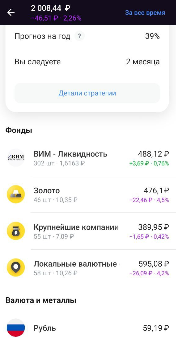 Уже 2.5 месяца я использую автостратегию "Фондовый спекулянт" от Т-Инвестиции. Открыла я этот счёт просто ради эксперимента на небольшую сумму. На следующий месяц банк дал повышенный кэшбэк за пополнение счета стратегии и я решила, что стоит эти воспользоваться. Правда в самый главный момент меня отвлекли, вместо того, чтобы пополнить счет на 10к и получить максимальный кэшбэк, я закинула 1к. А по условиям программы для тех, у кого уже было подключено автоинвестирование, кэшбэк рассчитывается только от первого пополнения, поэтому вносить еще 9к было бесполезно. А с другой стороны, моя невнимательность возможно спасла мои деньги... Кстати, что касается данной стратегии, она работает с БПИФ, поэтому имеет маленький порог входа. Есть стратегии, которые не подключишь если на счету будет меньше 50к. О том сколько принесло мне автоинвестирование за первый месяц я ранее писала у себя на канале. 17 января профит составлял +1.35%, что чуть ниже доходности фондов денежного за месяц вложений в н