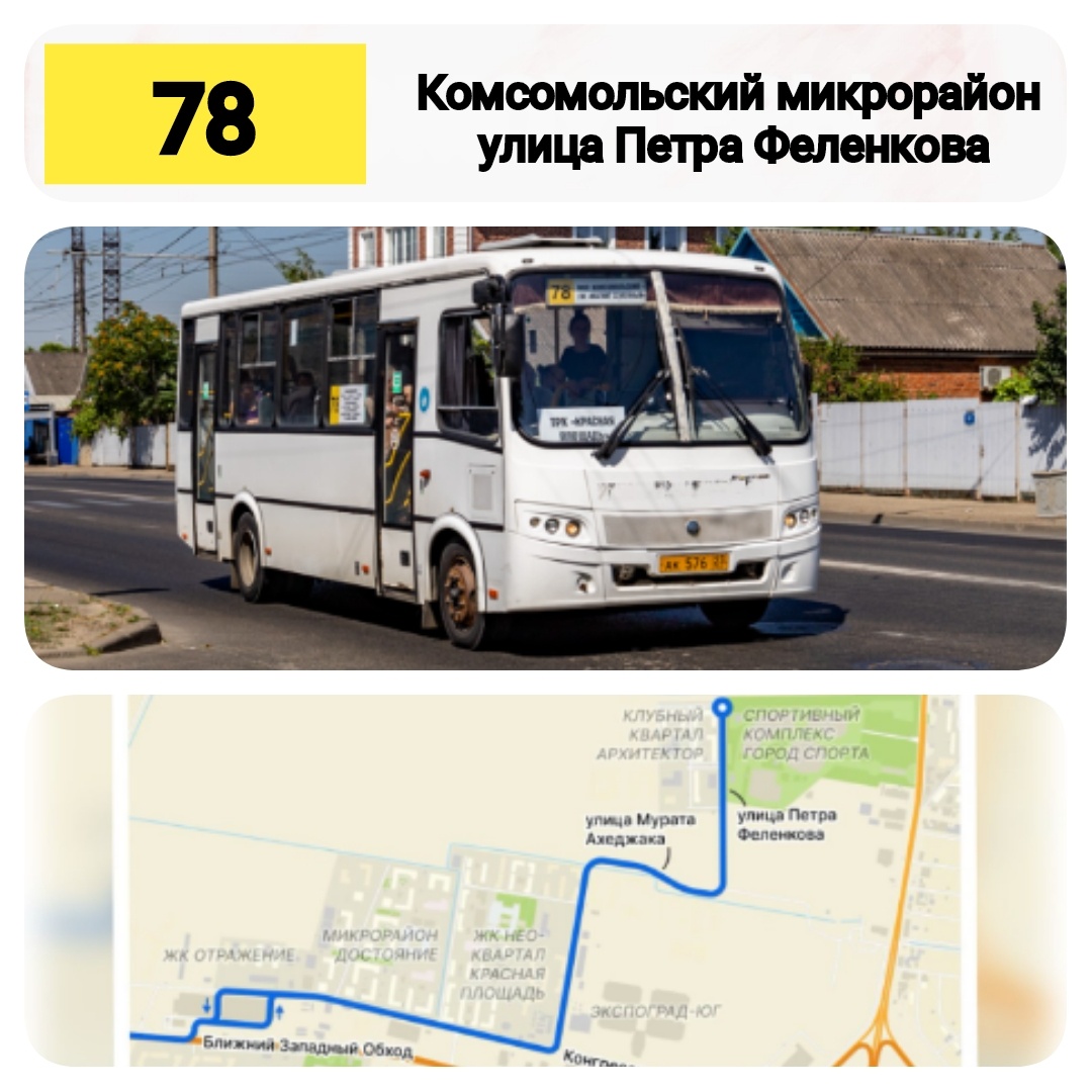 Автобусный маршрут 78 продлён до улице Петра Феленкова С 13 февраля 2025 года в городе Краснодар автобусный маршрут 78 изменил маршрут следование, теперь от ближнего Западного Обхода через остановку Гипермаркет Магнит по улице Конгресной через остановку филиал школы 102 по улицу Мурата Ахеджака до улице Петра Феленкова и обратно по маршруту до Комсомольского микрорайона. Читайте Городской транспорт Краснодар vk.com/gortranskrd ok.ru/gortranskrd dzen.ru/gortranskrd