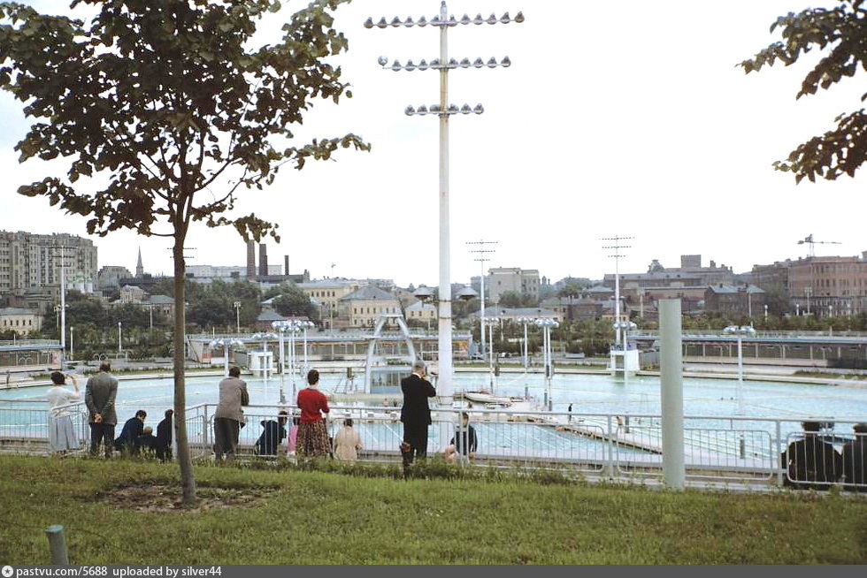 Давайте совершим очередное путешествие сквозь время, прогуляемся по волнам нашей памяти, вспомним, какой была жизнь во времена правления Леонида Брежнева и посмотрим, что изменилось за прошедшие десятилетия. Поехали! ... На фото вид от Волхонки на самый большой в Европе открытый круглогодичный бассейн "Москва". С другой стороны бассейна расположена Кропоткинская, ныне Пречистенская, набережная Москвы-реки. Фото 1975 года Вид с этой точки сейчас совсем другой. В 1994 году бассейн был закрыт, после чего на этой территории воссоздали снесенный в тридцатых годах Храм Христа Спасителя На этом фото вид от Волхонки в сторону Метростроевской улицы, ныне Остоженки. Судя по всему, эти трое молодых людей идут из бассейна "Москва", где они как-то применяли оборудование для водолазов, возможно, кого-то обучали им пользоваться. Слева на переходе типичная интеллигентная семейная пара москвичей. На противоположной стороне в угловом здании тогда работала столовая. Ещё в кадре можно увидеть автобус, так