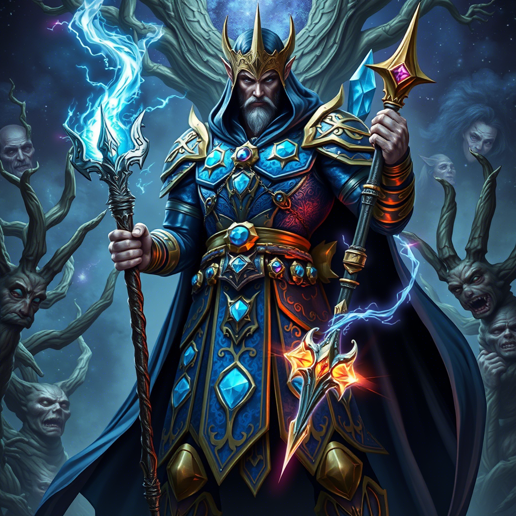 В правой руке он держал посох Вечного Света ✨🪄 — древний артефакт, чье синее пламя источало не только силу, но и спокойствие. Это пламя было направлено вверх, словно пытаясь пробиться сквозь темные кроны деревьев и разогнать тьму неба. В левой руке Астрос сжимал копье Звездной Защиты 🌟⚔️ — легендарное оружие, которое переливалось при каждом движении.