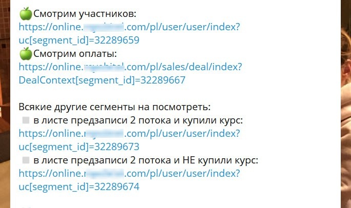 Когда запускается курс, у клиента в голове крутятся два главных вопроса: 1. Сколько денег мы уже заработали? 2. Сколько людей записалось на курс? Раньше клиенты часто запрашивали у нас эту статистику, но потом забывали о ней или теряли данные в хаосе информации. Чтобы решить эту проблему, моя команда придумала удобное решение. Как это работает: 1️⃣ Мы создали сегменты для просмотра статистики: 🟠Количество записавшихся людей. 🟠 Сумма заработанных денег. 2️⃣ Сразу после запуска курса мы отправляем клиенту ссылки на эти сегменты и закрепляем их в чате. 3️⃣ Клиент может самостоятельно зайти по ссылкам и посмотреть актуальные данные, не дожидаясь, пока мы предоставим отчёт. Почему это удобно: ✅ Клиент всегда видит актуальную статистику. ✅ Нет необходимости лишний раз обращаться к нам за цифрами. ✅ Всё организовано и доступно в одном месте. Теперь клиенты могут сосредоточиться на своих задачах, а мы — на своей работе, без лишних запросов и задержек. 🚀 🔥 - кто тоже хочет высоких продаж ⬇️