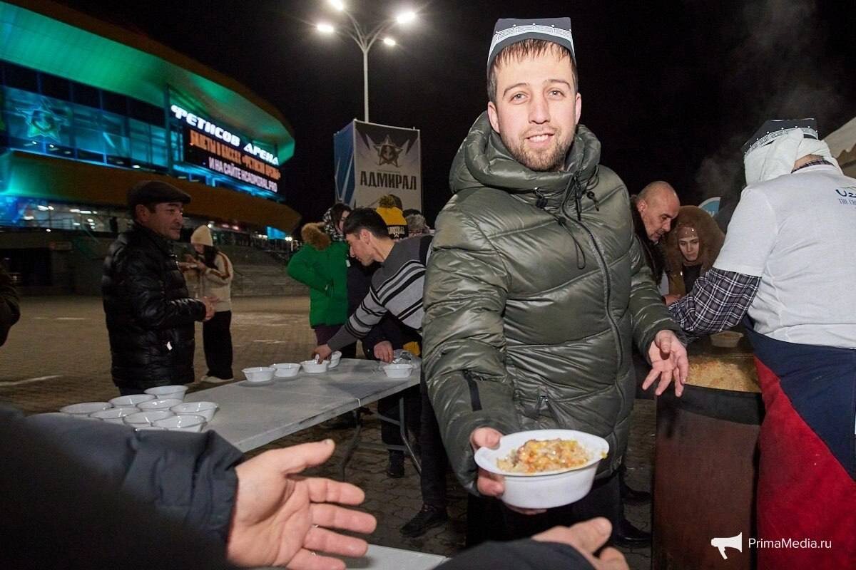 Мероприятие состоялось в рамках состязаний хоккейных команд "Адмирал" и "Автомобилист". Повара приготовили 200 кг блюда и угощали не только зрителей матча, но и всех желающих.