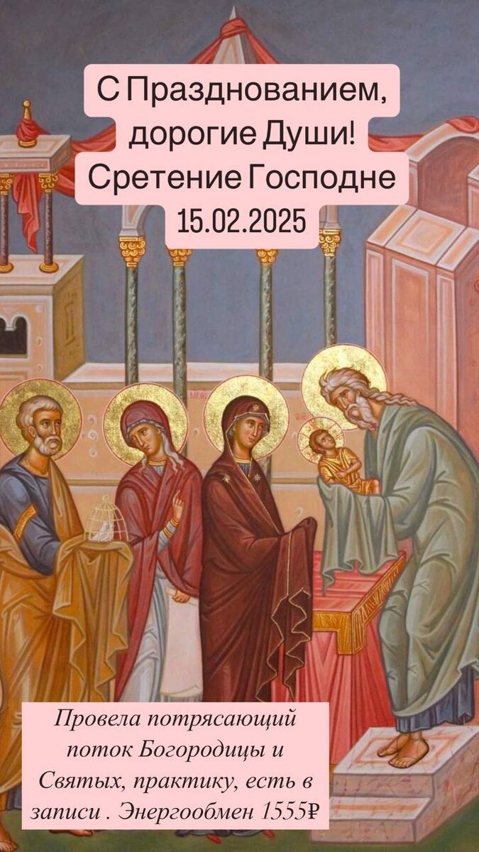 Сретение Господне 15.02 - большой праздник. Программа работает по цифре 9 и собирает весь спектр энергий. Сретение - это встреча! Встреча с Богом! Очень красиво , 14.02 - день влюбленных и открывается сердце в любви, а 15.02 - на открытом сердце и только так в новой мерности - происходит встреча с Богом!