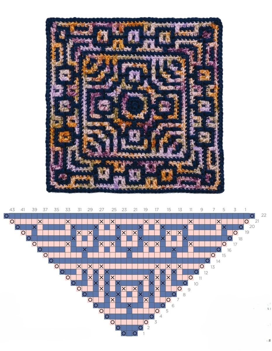 Оригинальные квадратные мотивы крючком связаны в удивительно простой и интересной технике мозаичного вязания. Хорошо эта техника тем, что жаккардовый узор вяжется одной нитью, но цвета чередуются в рядах. При вязании квадратного мотива нити не обрываются, а протягиваются по изнанке. Из жаккардовых квадратных мотивов можно связать плед, покрывало, подушку и много других стильных вещей для дома.