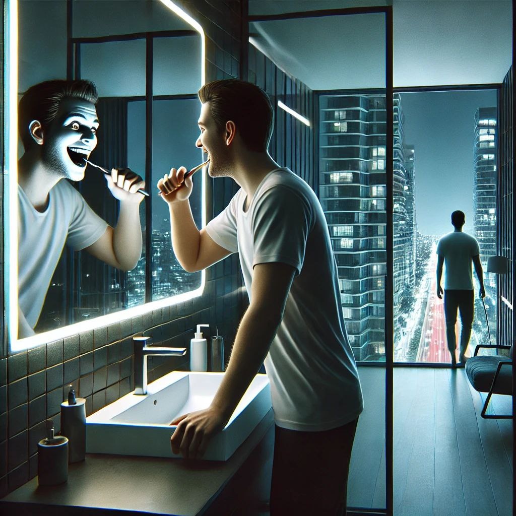 "Вы когда-нибудь задумывались, действительно ли ваше отражение повторяет вас? Даниил только что переехал в новую квартиру — современный небоскрёб в самом центре города. Идеальное место: минималистичный дизайн, панорамные окна, потрясающий вид. Но что-то было… не так. Впервые он заметил это, когда чистил зубы. Его отражение в зеркале двигалось с крошечной задержкой. Едва уловимо, но всё же. Он списал это на усталость и лёг спать. На следующую ночь, проходя мимо зеркала в коридоре, он был уверен, что его отражение повернуло голову после того, как он уже отвернулся. Сердце сжалось. Просто кажется, успокоил он себя. Но на третью ночь сомнений не осталось. Он встал перед зеркалом, внимательно вглядываясь в своё отражение. Оно стояло неподвижно. Даниил выдохнул с облегчением. И тут — моргнул. Его отражение не моргнуло. Даниил похолодел. Медленно поднял руку. Отражение повторило движение. Он повернул голову. Оно последовало за ним. Он наклонился ближе, дыхание затуманило стекло. Отраж