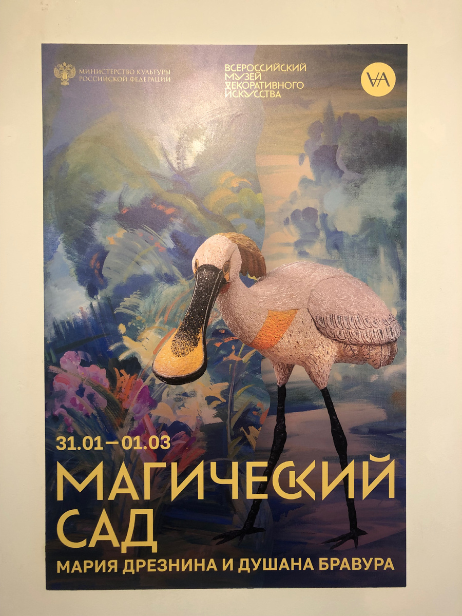 На выставку я попала абсолютно случайно, когда пришла в музей посмотреть драгоценности и платья советских дам. В музее так много залов, что немудрено запутаться. Ища нужную мне выставку я обнаружила небольшой зал с яркими картинами и огромными птицами и, конечно, заинтересовалась. Организаторы с помощью чудесных произведений искусства попытались создать волшебный сад, где среди крымских пейзажей, цветущих и плодоносящих деревьев гуляют экзотические птицы. Экспозиция меня настолько захватила, что захотелось узнать о талантливых авторах побольше.
