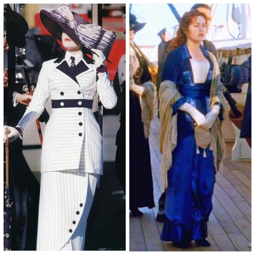 По итогам голосования темой нового коллаба мастеров стало море, что, честно говоря, поначалу меня несколько обескуражило. Пираты и русалки меня не привлекают, морских принцесс в пышных платьях делать неинтересно. Однако вовремя я вспомнила замечательный фильм Джеймса Кэмерона "Титаник" - самая морская тема, согласитесь. Главная героиня - Роза Дьюитт Бьюкейтер - в фильме появляется в нескольких платьях, большинство которых юная леди носила бы не только на корабле, но и на суше, однако есть два по-настоящему "морских" платья: белый шерстяной костюм, в котором мы впервые видим Розу на экране, и синее платье, в котором она "летит" на носу корабля. Если получится, сделаю оба наряда, но план-минимум - белый костюм (со всеми аксессуарами, конечно). Фанаты раскопали прообраз белого костюма и выложили в сеть. Вот он: На мой взгляд, наряд в фильме более элегантный и дорогой: полоски тонкие, пуговицы меньше, не такие громоздкие, нет меха. Блуза с наглухо застегнутым воротником и галстуком-удавкой