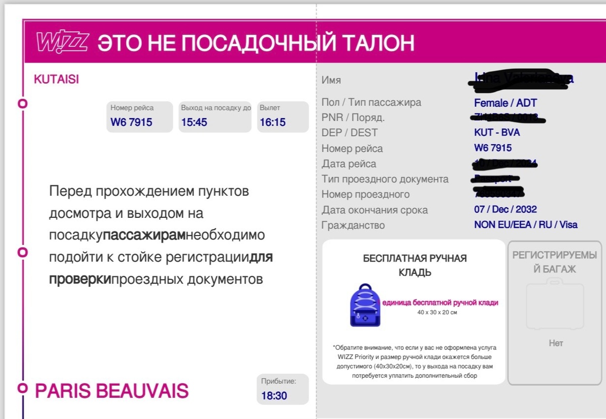 ЭТО НЕ ПОСАДОЧНЫЙ ТАЛОН Вздыхаю, глядя на это чудо, которое называется ЭТО НЕ ПОСАДОЧНЫЙ ТАЛОН. Как такое можно выдумать? Было очень смешно, когда я получила это на почту после регистрации. Посадочный, но такой недопосадочный. Я первый раз летела авиакомпанией Wizz air. Читала много отзывов и все они были достаточно неоднозначные. То не пускают на рейс, так как у тебя слишком большая ручная кладь, заставляют доплачивать за это. То вылет опаздывает и вовсе его отменяют. Или откладывают рейс на трое суток. Тьфу тьфу, вроде бы такие ужасы обошли меня стороной. Но, конечно же есть нюансы, которые стоит учесть. Например, в Кутаиси очень долгая регистрация. Вы идете к стойке регистрации с НЕ посадочным талоном. Ну как идете. Очередь на регистрацию огромная и очень-очень медленная. У всех дотошно проверяют документы. Девочки на регистрации просто в мыле. Докапываются до всех, до всего. Но есть хороший момент, несмотря на то, что ручная кладь должна быть очень маленькая 40 на 30 на 20, с рюкза