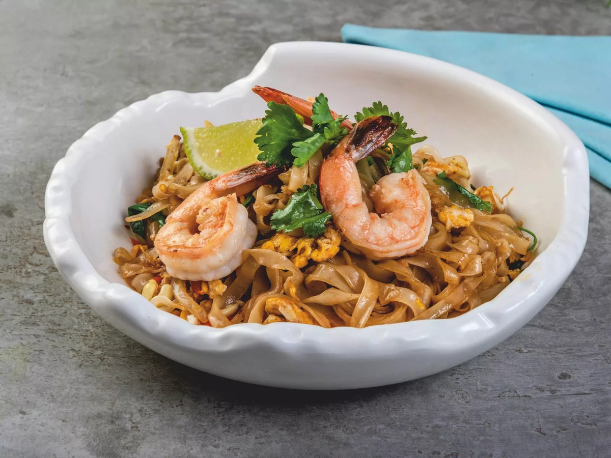 “Пад Тай: Популярное тайское блюдо с рисовой лапшой, креветками, тофу и арахисом!”