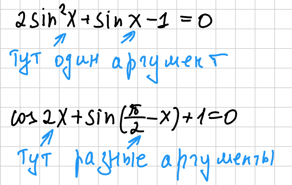 Неискушённый человек глядя на тригонометрическое уравнение не сразу поймёт с чего нужно начинать. Поговорим об универсальных методиках решения. Полагаем, что мы уже знаем как решать простейшее тригонометрическое уравнение и как решать алгебраические уравнения, в частности, группировкой. С чего начинаем? Нужно привести к одному аргументу. Что есть аргумент? Это то, стоит под вашей тригонометрической функцией. Допустим вот. Как приводить к одному аргументу? 1. Формулы приведения. 2. Формула двойного угла (тройной угол не встречал на ЕГЭ). 3. Формулы суммы/разности аргументов. Собственно вот они все: Уравнения решаемые третьим методом встречаются крайне крайне редко. Потому основной упор делаем на формулы приведения и двойной угол. Окей. Привели к одному аргументу - что дальше? А дальше смотрим. Можем ли мы свести всё к одной функции (sin, cos, tg, ctg) или нет. Опять же, свести без возникновения корней и прочих вещей, усложняющих вид уравнения. Если да - то вводим замену и решаем как