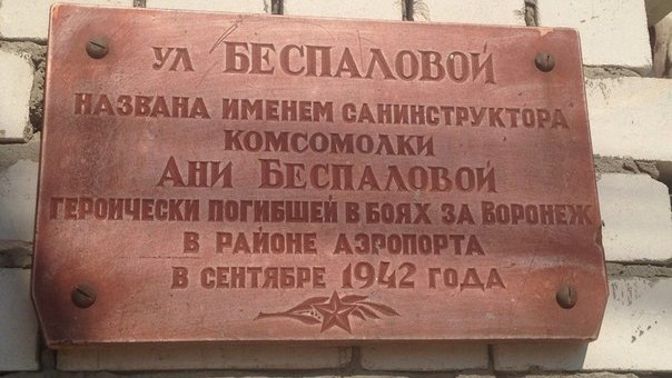 Улица Ани Беспаловой находится в Коминтерновском районе г. Воронежа. Однако сведений о жизни той, чьим именем названа эта улица, очень мало.