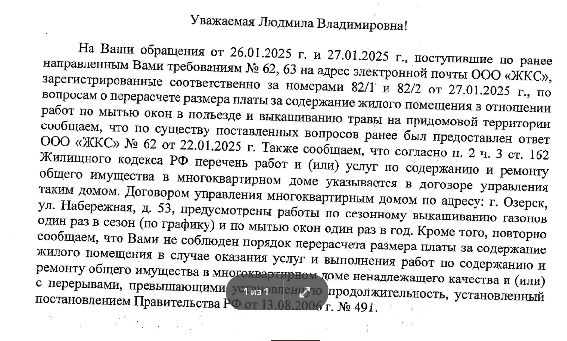 Итак, бодаемся. С укашкой. Коллективно. Последняя фраза: о том, что перерасчёт нужен всему дому, поскольку запрос - коллективный. Ход чёрных № 2 в ответ на ход белых. Ответ от 10 февраля: О том, о сём. Работы предусмотрены. Ни о чём. Цитаты из правил. А про перерасчёт - так "мы вам уже ответили ранее". То есть перерасчёта не будет. Мы там вам ранее намекали, что перерасчёта не будет. Хитрость в том, что фраза: фраза означает, что вы - жильцы - не имели право составлять акт о том что мы - укашка - что-то нарушили и не сделали, не пригласив нас удостоверить этот акт. То есть надо ОБЯЗАТЕЛЬНО пригласить укашку, чтобы ткнуть её носом, что они не исполнили то, что исполнить обязаны. Понимаете, да? Мы не исполнили. Мы знаем. Трава летом была по пояс, а окна не мыли за 10 лет ни разу. Фото есть. Но вы нас пригласите, чтобы мы удостоверили ваш акт..........А мы не будем этого делать, нам это невыгодно. Идите в суд. Как всегда. Сказка про белого бычка на этом закончилась. Она сказала, что