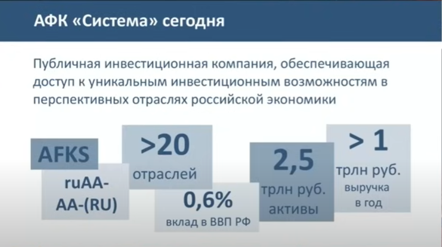 АФК Система - уникальный инвестиционный холдинг на российском фондовом рынке, который владеет предприятиями во всех отраслях РФ кроме нефтяной и горнорудной. Деятельность Группы заключается в приобретении бизнесов на ранних стадиях, "прокачке" до уровня топ-3 на рынке присутствия, выведении на IPO и трансформации в "дойную корову" с максимальным дивидендным потоком для финансирования новых инвестиций. Так, с 2000 года Группа вывела на фондовых рынок 13 предприятий.