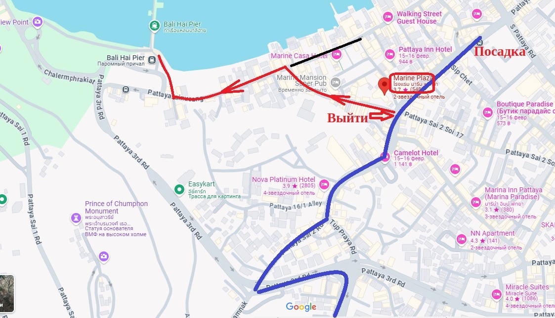 Выйдя возле него пойти по улице между отелем и магазином 7/Eleven в сторону моря. Через 5 -7 минут вы окажетесь на Walking Street и по ней повернуть налево в сторону причала Bali Hai (красная линия на схеме). Через 10 минут вы уже на причале Бали Хай.