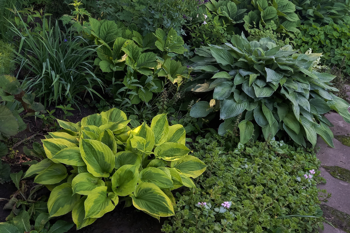 Слева направо: Tokudama Flavocircinalis, Fortunei Hyacinthina и на заднем плане Blue Mammoth... Можешь оценить масштабы бедствия... Учитывая, что апофеоз пришелся как раз на середину лета-2023...