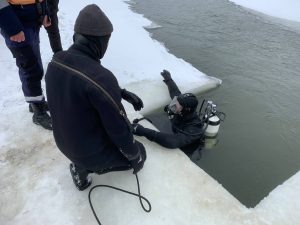 В центре Оренбурга 15 февраля работали водолазы и спасатели. В реке Урал утонул 24-летний мужчина. Инцидент произошел между стелой Европа-Азия и железнодорожным мостом. Обстоятельства инцидента пока не уточняются. — В целях безопасного спуска и погружения водолазов в ледяном покрове реки бензопилой спасатели вырезали майну с ровными краями, — рассказали в департаменте пожарной безопасности и гражданской защиты Оренбургской области. В течении нескольких часов в зимних водолазных костюмах водолазы областной службы спасения осуществляли поисковые работы. Поиск результата не дал. Работы под водой продолжатся в последующие дни в светлое время суток. Ранее оренбуржцев предостерегли от выхода на лед Урала. Из-за спуска с Ириклы он по-прежнему тонкий. фото: департамент пожарной безопасности и гражданской защиты Оренбургской области