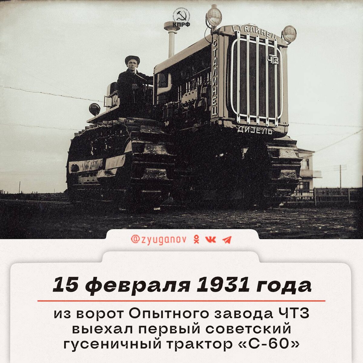 15 февраля 1931 г. из ворот Опытного завода ЧТЗ (Челябинский тракторный завод) выехал первый советский гусеничный трактор «Сталинец-60».