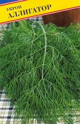 УКРОП АЛЛИГАТОР Аллигатор укроп - холодостойкая светолюбивая культура. Предпочитает лёгкие, увлажнённые почвы. Высев делают на глубину 2-3 сантиметра с мульчированием торфом. Всходы появляются на 10-15 день. Оптимальная температура культивации 18-21 градусов по Цельсию. Уход необходим в рыхлении междурядий, рыхлении и подкормке. Для получения ранней зелени в открытом грунте семена укропа высевают под зиму, по замёрзшей почве. Это среднеспелый сорт укропа кустового типа. Крупные сильнорассечённые листья образуют густой раскидистый куст. У листьев приподнятая розетка. Медленное стеблевание обеспечивает продолжительное получение нежной ароматной зелени.