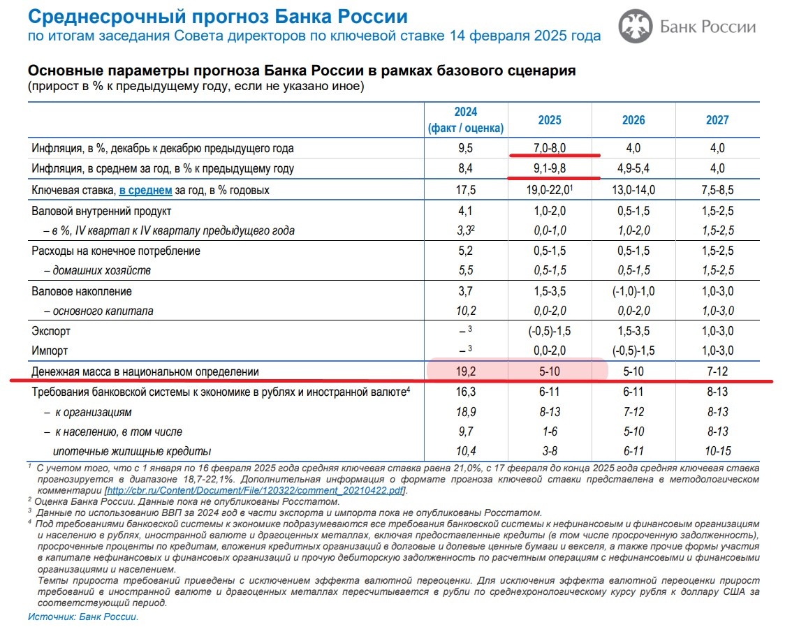14 февраля Банк России опубликовал обновленный прогноз по инфляции, в котором в очередной раз сдвинул достижение своего целевого уровня во времени и повысил прогнозный диапазон на 2025 и последующие годы. Подобным образом он поступает буквально при каждом пересмотре прогноза где-то с середины 2023 года. Если ранее регулятор почему-то ожидал уровень инфляции на конец 2025 года 4,5-5%, то теперь прогноз вырос сразу до 7-8% - это в 1,55-1,6 раза. Очень существенно. А среднегодовой уровень ожидается как 9,1-9,8%. Однако и такие значения я считаю абсолютно недостижимыми в текущей ситуации, и полагаю, что прогноз будет еще не раз пересмотрен. Среднегодовое значение инфляции и ее значение на конец года, в моем видении, будут выше 10%. В прогнозе ЦБ можно указать на конкретное место, из-за которого не сбудется этот прогноз. Это прогноз по росту денежной массы, выделил данную строку. Почему-то ЦБ вдруг решил, что денежная масса, которая все последние годы росла в районе 20% ежегодно, в 2025 год