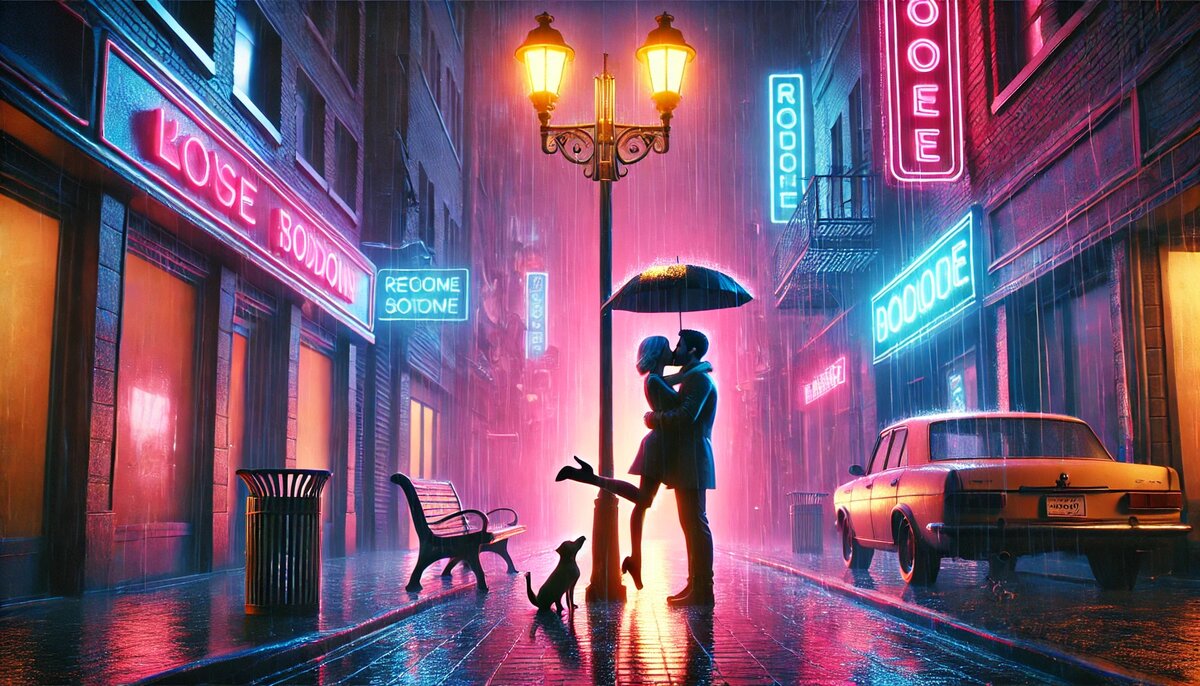 Дождь хлестал по мостовой, неоновые вывески отбрасывали цветные блики на мокрый асфальт, а под старинным фонарем целовались двое. Было в этом что-то волшебное: романтика, страсть, атмосфера ночного города… и мокрая собака, которая ошалело крутилась у их ног.