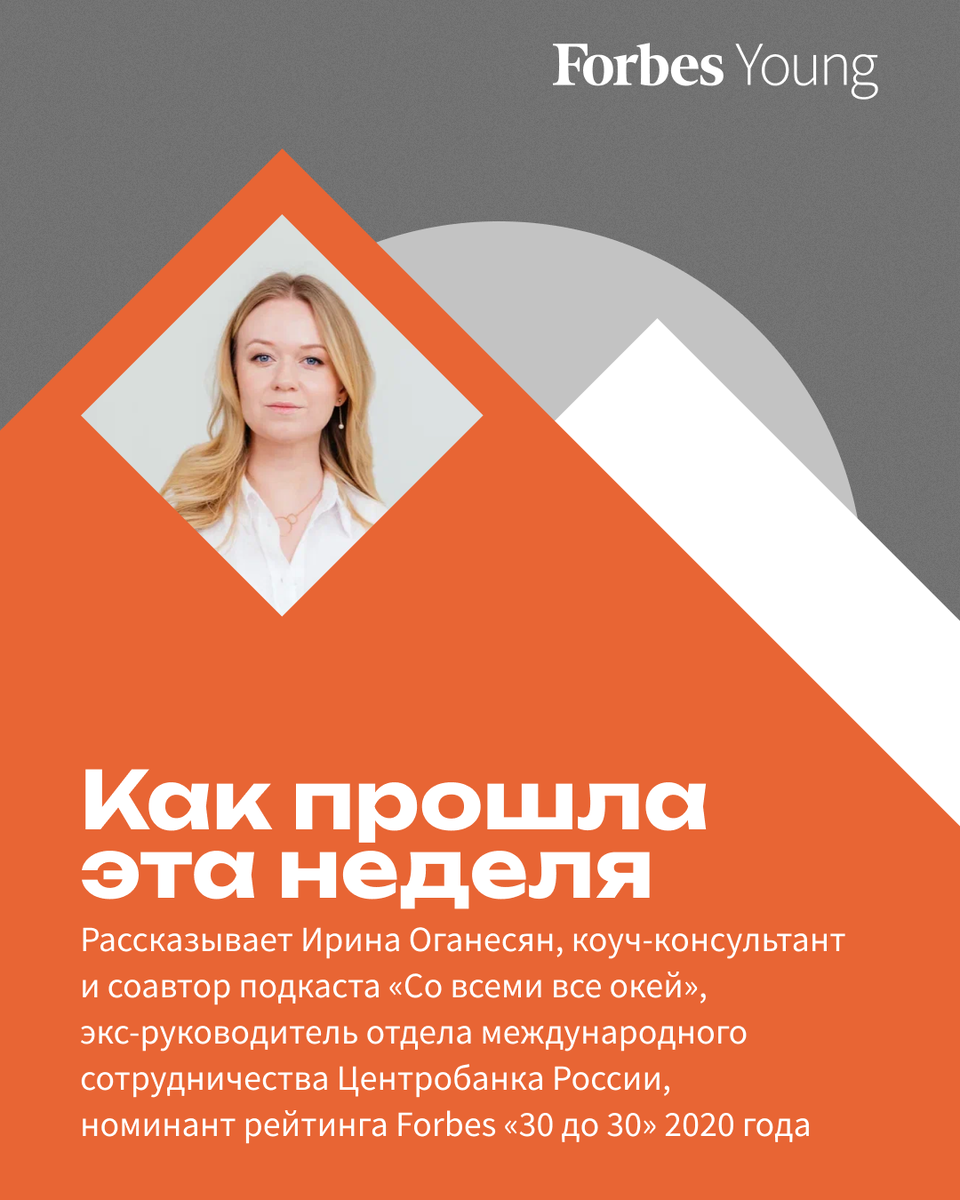Сегодня в рубрике «Как прошла эта неделя» о своей жизни рассказывает Ирина Оганесян — 32-летняя коуч-консультант, соавтор подкаста «Со всеми все окей». Как прошла твоя неделя? Неделя ураганная: менторинги опытных коллег, вебинар западного профи, экзамен на новый уровень международной аккредитации, запись выпуска подкаста. Большой хайлайт — моя гостевая лекция на курсе для растущих руководителей. А еще я отхватила билеты на концерт Джей Ло, предвкушаю! Чем ты занимаешься? После восьми лет работы в Центробанке России, я впервые работаю на себя. В частной практике я коуч для тех, кто хочет перемен, в американском стартапе Hire5 я коуч для команды. Мой собственный стартап — это подкаст «Со всеми все окей», который я создаю вместе с Полиной Перушевой. Чем ты увлекаешься? Люблю читать, обсуждать книги, искать непопулярные жемчужины и раскапывать экземпляры с автографами. Обожаю искусство. Шучу, что на балет хожу чаще, чем на маникюр. Какие планы на будущее? Хочу начать преп